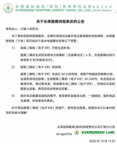 為了更好的提供提箱服務(wù),合理利用我司設(shè)備并保證集裝箱的有效周轉(zhuǎn),長(zhǎng)榮國(guó)際船務(wù)(寧波)即日起對(duì)寧波本地提箱業(yè)務(wù)做以下調(diào)整:提箱二維碼生成時(shí)間將改為船靠前(含船靠當(dāng)天)6天,開放提箱時(shí)間為船靠前5天(含船靠當(dāng)天)。提箱二維碼(電子EIR)生成后24小時(shí)有效,請(qǐng)客戶根據(jù)實(shí)際做箱計(jì)劃,合理安排合理領(lǐng)取空箱。生成提箱二維碼(電子EIR)24小時(shí)內(nèi),未至指定點(diǎn)提領(lǐng)空柜,將過期失效;若提箱生成二維碼(電子EIR),但最后為實(shí)際提箱出運(yùn)者,我司后續(xù)會(huì)做艙位控管。對(duì)于非正式渠道提到的柜子,我司會(huì)在裝船前后對(duì)比,一經(jīng)確認(rèn),當(dāng)即做退關(guān)處理,并收取相關(guān)費(fèi)用。