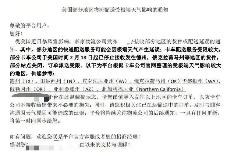 2021年新年剛過,美國那邊暴風(fēng)雪襲來不少地區(qū)停水停電,以美國德州地區(qū)最為嚴(yán)重。還給交通帶來了非常糟糕的情況,這些大雪封路的地區(qū)無論是FBA頭程尾端部分還是FBA部分都會有1-3周的延遲。