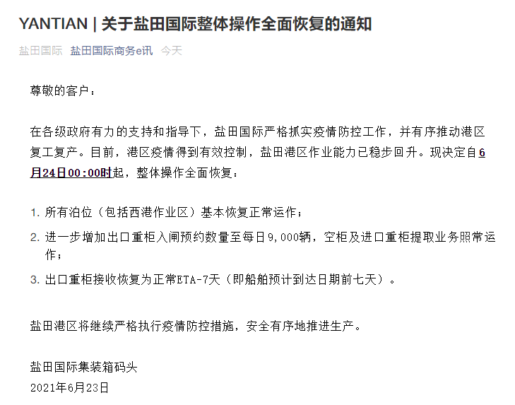 1.鹽田國際整體操作6月24日全面恢復(fù)