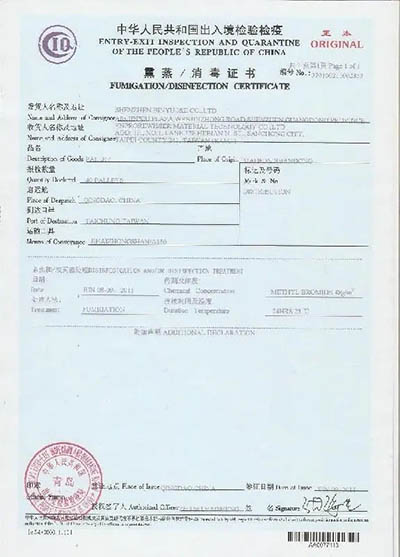 6)熏蒸完畢后,向商檢局索要熏蒸證明書;