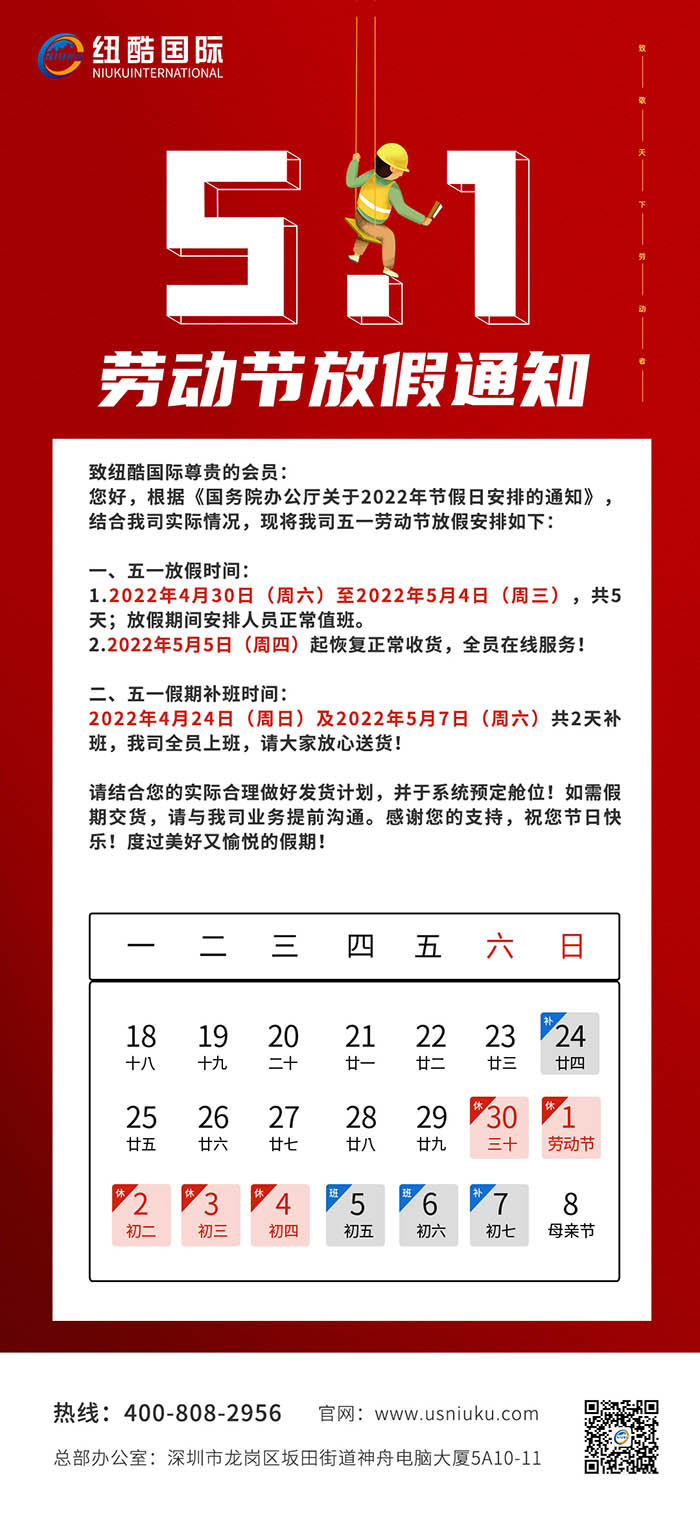 致紐酷國際尊貴的會員:五一放假時間: 1.2022年4月30日(周六)至2022年5月4日(周三),共5天;放假期間安排人員正常值班。 2.2022年5月5日(周四)起恢復(fù)正常收貨,全員在線服務(wù)!